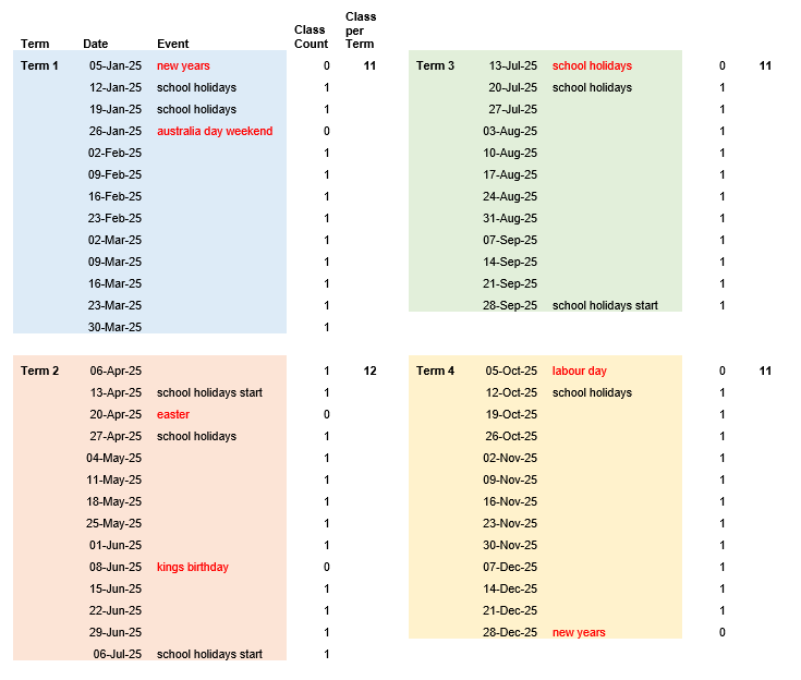 Classes: Sunday 8:00am to 9:30am (No classes on all public holidays or long weekends)